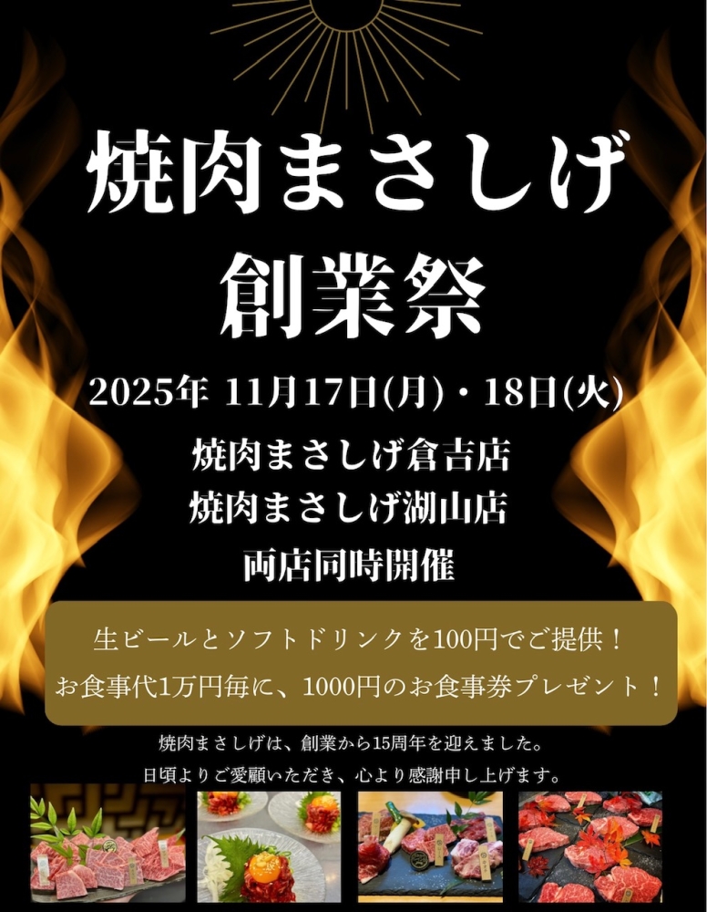 ◎お食事代1万円毎に、焼肉まさしげ両店で利用できる1000円のお食事券をプレゼント!